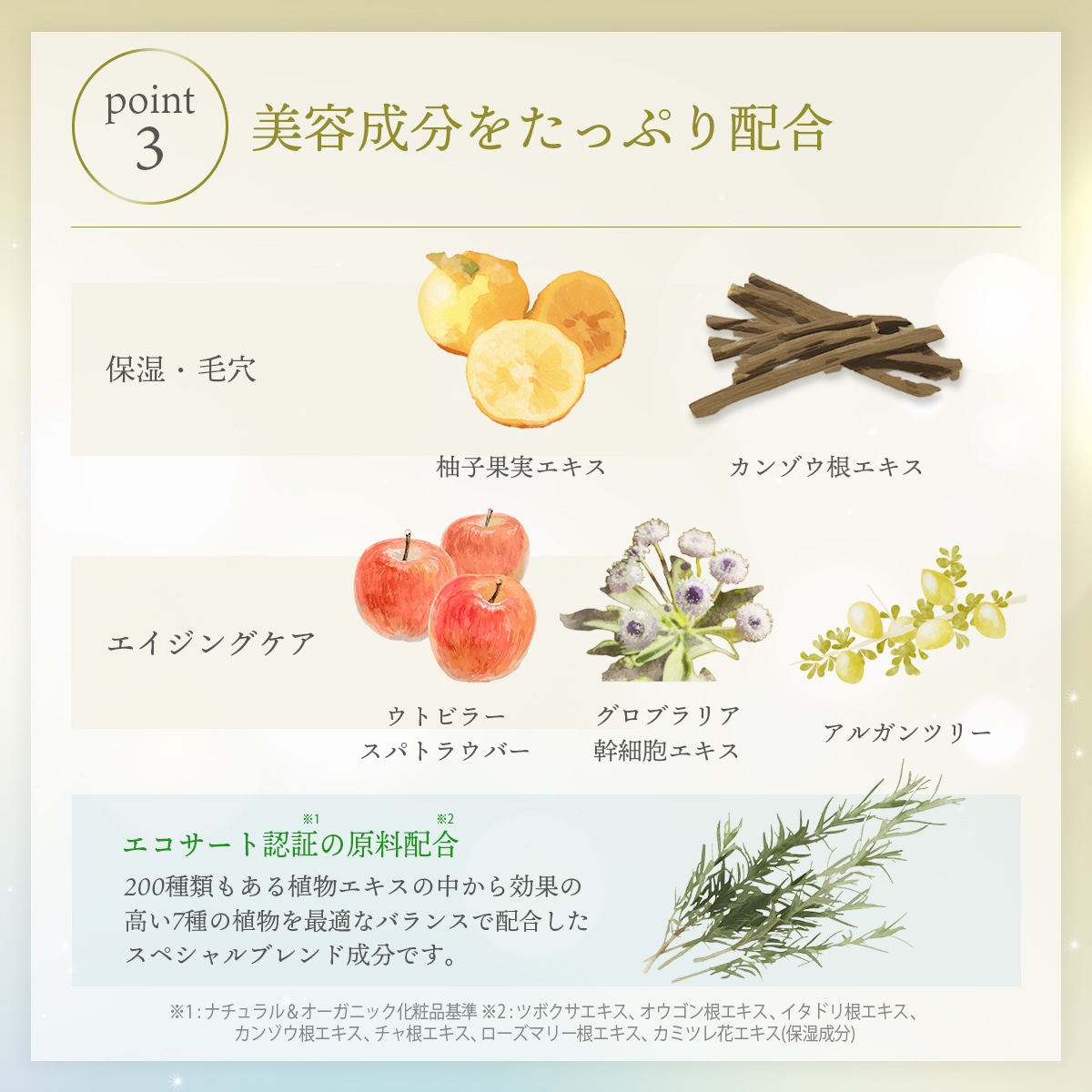 | 成分 | 水,ヤシ油脂肪酸PEG-7グリセリル,DPG,メチルグルセス-10,カルボマー,メチルパラベン,フェノキシエタノール,ラウロイルグルタミン酸ジ(フィトステリル/オクチルドデシル),水酸化K,キサンタンガム,ヒアルロン酸Na,BG,グリチルリチン酸2K,トリ(カプリル酸/カプリン酸)グリセリル,イソマルト,オクチルドデカノール,エタノール,グリセリン,加水分解レピジウムメイエニ根,マルトデキストリン,グロブラリアコルジホリアカルス培養エキス,ベタイン,フラガリアチロエンシス果汁,エチウムプランタギネウム種子油,PCA-Na,リンゴ果実培養細胞エキス,ツボクサエキス,ヒマワリ種子油不けん化物,ソルビトール,フランスラベンダーエキス,イタドリ根エキス,オウゴン根エキス,セリン,ヤグルマギク花エキス,ヨーロッパシラカバ樹皮エキス,ベルガモット果実エキス,ボタンエキス,チャ葉エキス,フウセンカズラ花/葉/つるエキス,ヒメフウロエキス,グリシン,カンゾウ根エキス,加水分解バオバブエキス,レシチン,アルガニアスピノサカルス培養エキス,ハトムギ種子エキス,グルタミン酸,カシア樹皮エキス,カミツレ花エキス,ローズマリー葉エキス,アラニン,アルギニン,リシン,トレオニン,プロリン,アーチチョーク葉エキス,ユズ果実エキス,香料 |