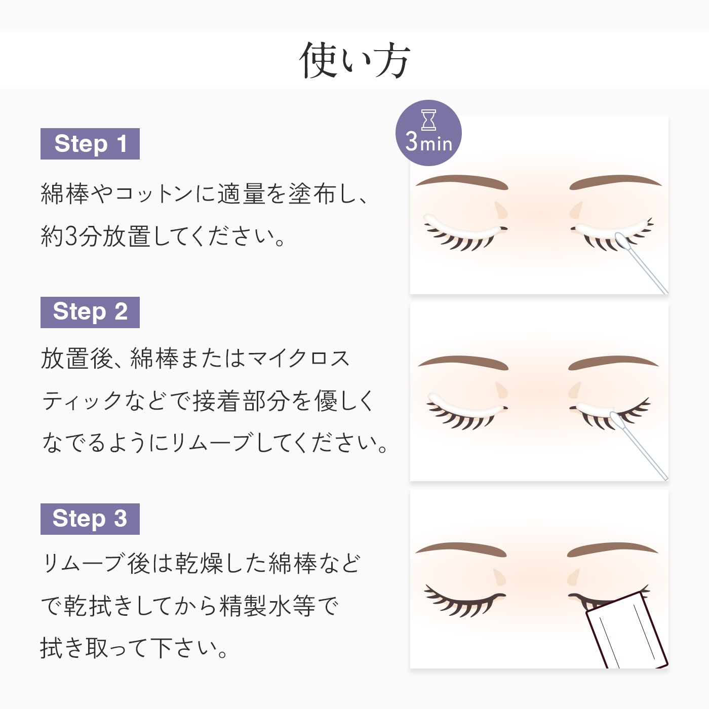 | 使用方法 | 【注意】長時間の放置はジェルが液化する原因となります。 容器から適量(ツイーザー先端で1すくい程度)を取り、取りたいグルーの上に置き、なじませます。 1本に対し約10秒未満でほとんどのエクステはオフできます。オフ後は、精製水やプライマーを染み込ませた綿棒等で残りのジェルをきれいに除去し、残らないようにご注意ください。 ※束タイプの場合は時間がかかるので、クリームリムーバーをご使用ください。 ※初めてご使用される場合は、必ず取扱い説明書をご覧の上ご使用ください。 |